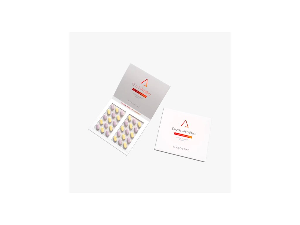 Dual ProBio je určený pro posílení imunity a podporu správné funkce trávicího systému u dětí. Je mimořádně vhodný během užívání léků a antibiotik pro doplnění střevní mikrobioty. Díky vitamínu D přispívá k normální funkci imunitySložení: Fruktóza (plnivo), rozpustná kukuřičná vláknina, maltodextrin (plnivo), kravské kolostrum, fermentovaný prášek z 10 druhů ovoce (aceroly, černého rybízu, borůvek, třešní, aronie, brusinek, angreštu, moruše, malin a jahod), rakytníkový extrakt, směs probiotických kmenů (Streptococcus salivarius K13, Streptococcus salivarius SAL21, Bifidobacterium lactis Bi-07, Lactobacillus acidophilus NCFM, Bifidobacterium lactis BI-04, Lacticaseibacillus paracasei Lpc 37), extrakt z červené řepy (barvivo), betaglukan z hlívy ústřičné, jahodové aroma (látka zvýrazňující chuť a vůni), hydroxypropylmethylcelulóza (stabilizátor), oxid křemičitý (protispékavá látka), stearan hořečnatý (protispékavá látka), vitamín D (zdroj cholekalciferol).